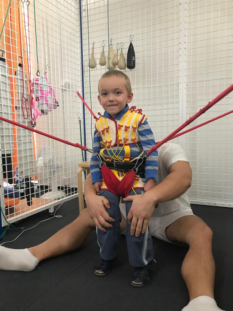 Garikovi slouží k pohybu invalidní vozík. Cílem je, aby se naučil chodit o berlích.