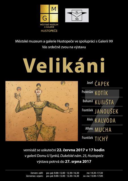 Městské muzeum a galerie Hustopeče a Galerie 99 manželů Vojtkových z Břeclavi Vás srdečně zvou na mimořádnou výstavu děl předních umělců českého výtvarného umění s názvem Velikáni. Muzeum je otevřeno v sobotu i v neděli od 13.00 do 17.00 hodin. Výstava potrvá do 27. srpna.