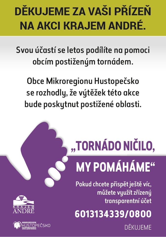 Pořadatelé víkendových akcí na Hustopečsku - Slunovrat s vínem a Krajem André - se rozhodli obě akce uspořádat. Získají však nový rozměr - výtěžek s akcí poputuje obcím zasaženým čtvrtečním tornádem.