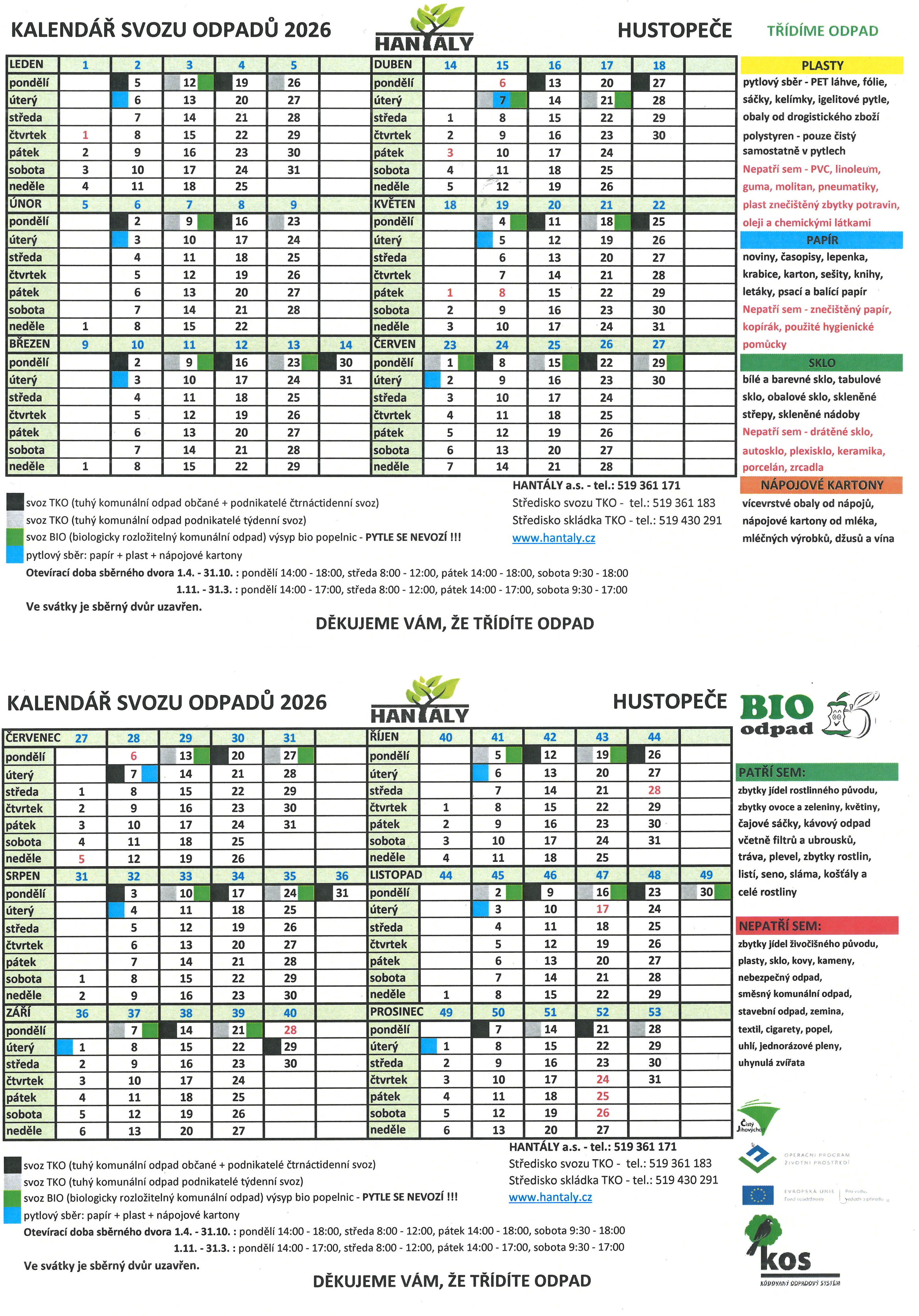 Jedním ze základních kamenů systému je měsíční pytlový svoz tříděného odpadu – papíru, plastů a nápojových kartonů od nápojů dle Kalendáře svozu odpadů Hustopeče od společnosti Hantály s termíny svozu. Pytle je vhodné umisťovat před dům večer den předem. Jednotlivé vytříděné odpady patří do zvláštních pytlů. Pytle jsou k dispozici na vrátnici Městského úřadu v Hustopečích, stará pošta. Pokud bude na pohled jasně zřejmý druh odpadu, je jedno, do jakého obalu (pytle) tříděný odpad nachystáte nebo jak jej svážete. Kvůli tomu nejsou vhodné neprůhledné pytle; papírové krabice použijte jen pro papír. Nápojové kartony je nutné vypláchnout vlažnou vodou, potom rozložit a uskladnit samostatně do pytle nebo pevně převázat provazem a takto nachystat před dům.